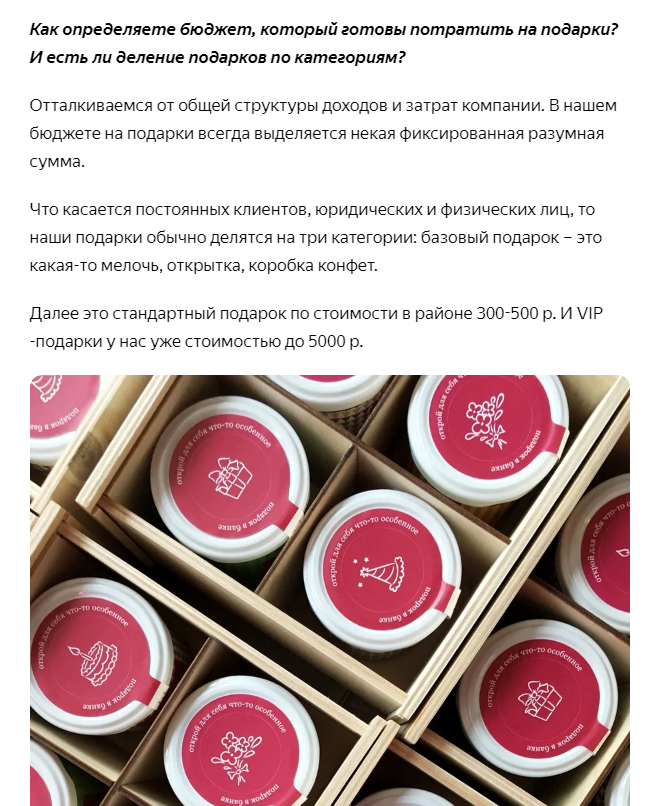 Что касается постоянных клиентов, юридических и физических лиц, то наши подарки обычно делятся на три категории: базовый подарок – это какая-то мелочь, открытка, коробка конфет.